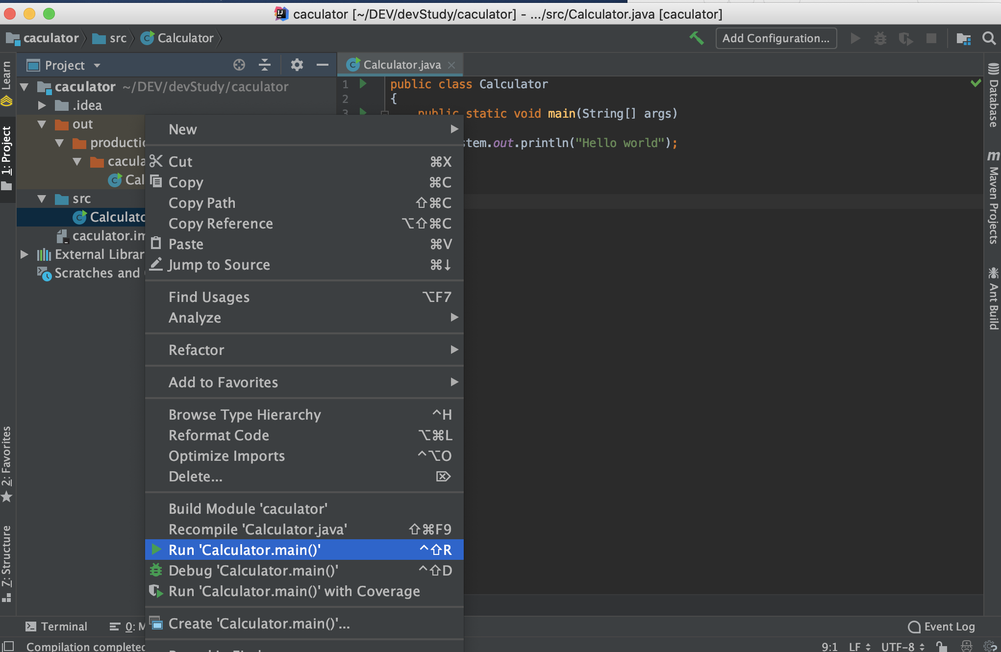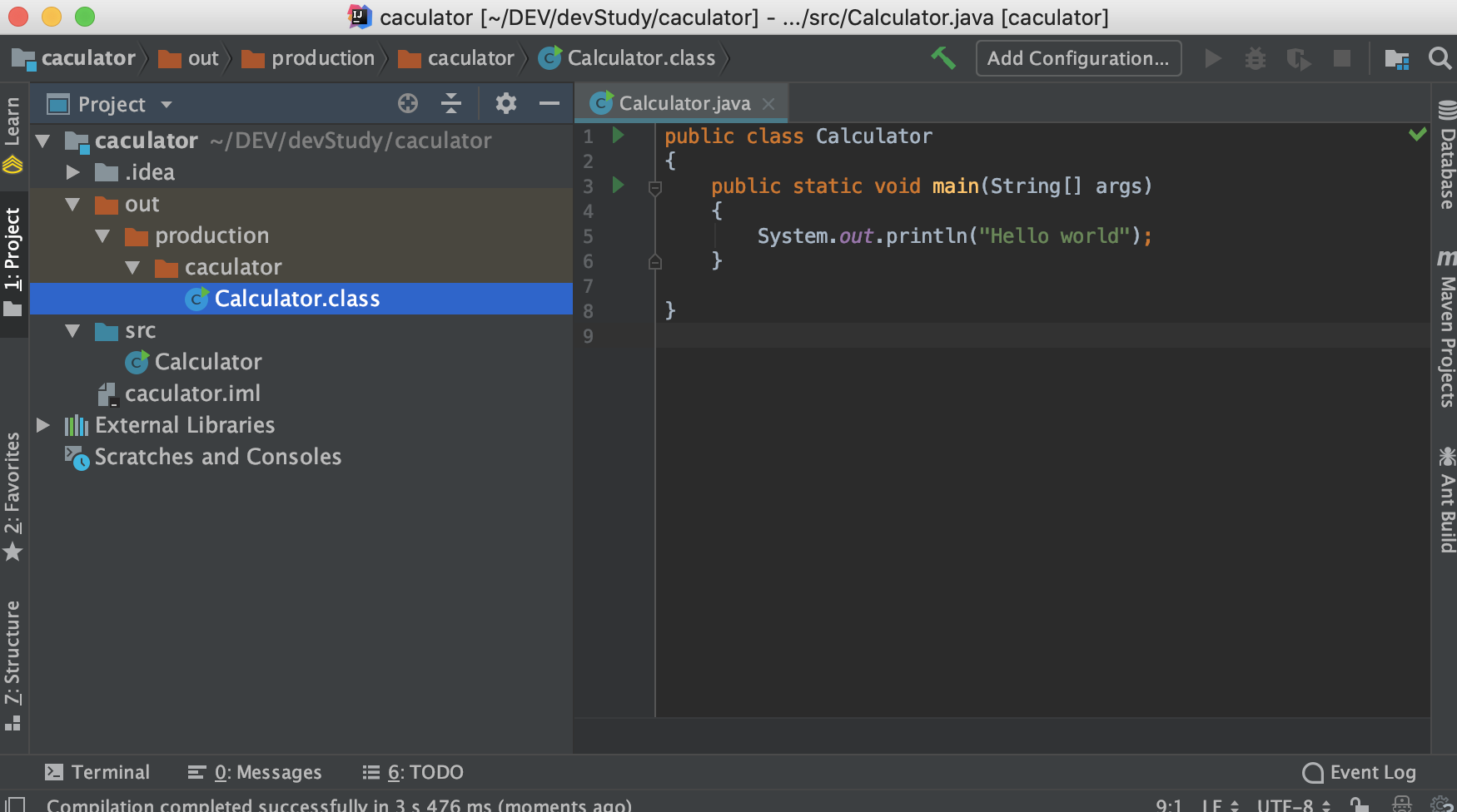 빌드를 수행하고 나면 [out] - [production] - [calculator] - [Calculator.class] 파일이 생성된 것을 확인할 수 있다.