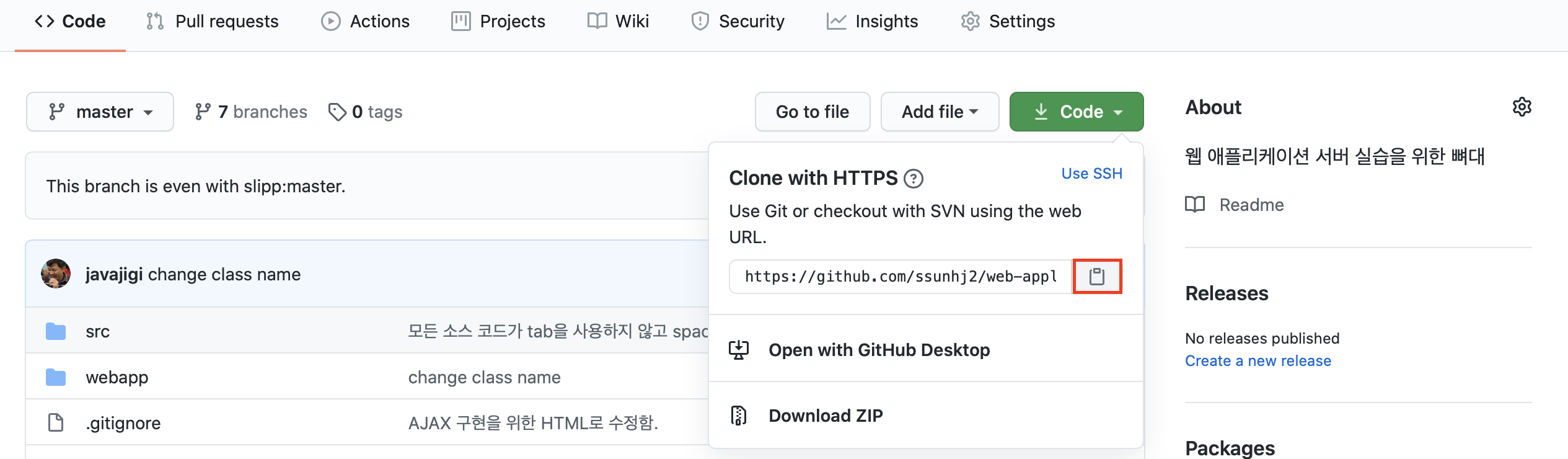 상단의 [Code] 버튼을 클릭하면 web URL이 표시된다.