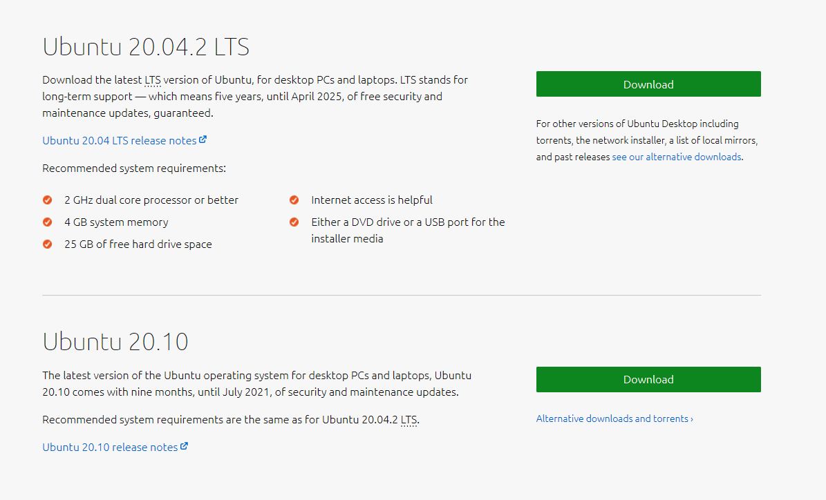 따라서 Ubuntu 20.04.2는 20년 4월에 배포된 버전이고, Ubuntu 20.10은 20년 10월에 배포됐다는걸 알 수 있습니다.