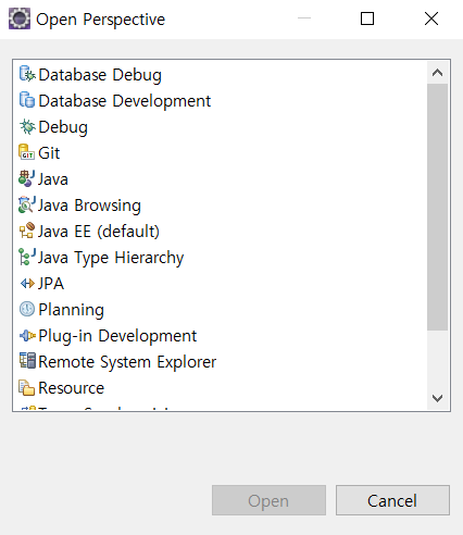 아래 빨간박스의 아이콘을 클릭하면 Perspective 목록을 확인할 수 있습니다. (이클립스 오른쪽 상단)