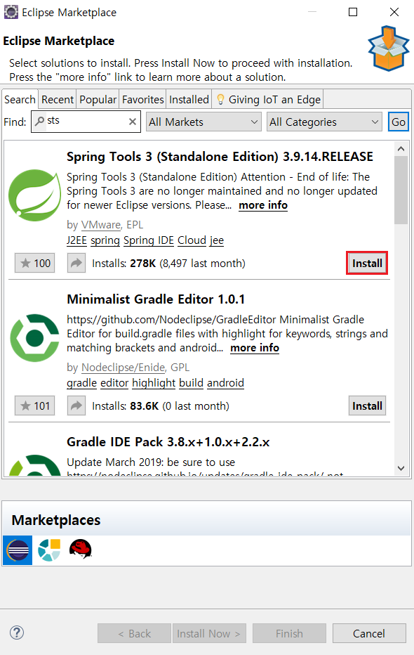 Eclipse Marketplace에서 STS를 검색합니다.