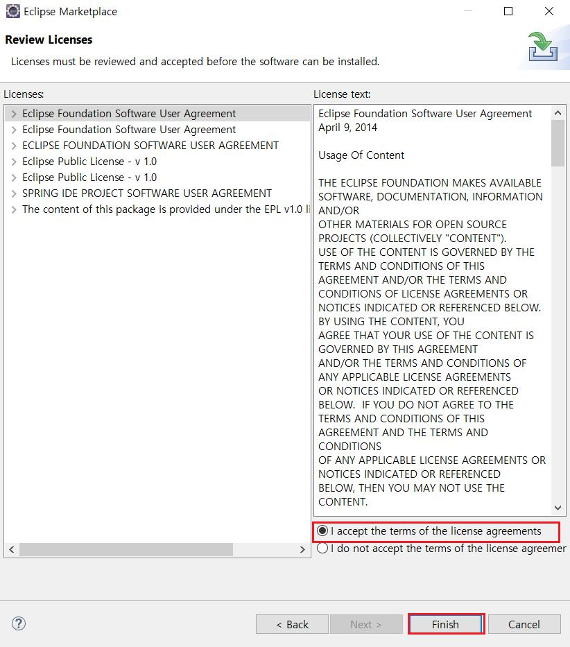 license 약관에 동의한뒤 [Finish] 버튼을 클릭합니다.