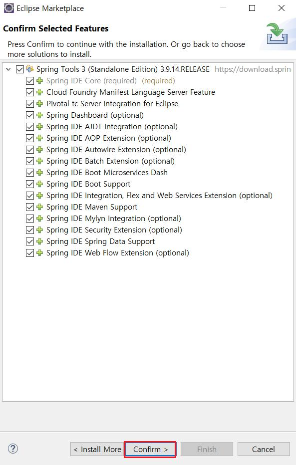검색 목록에서 Spring Tools 3 (Standalone Edition) 의 [install] 버튼을 클릭해 설치를 진행합니다.