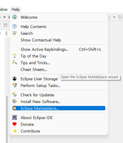 이클립스의 상단 메뉴에서 [Help] > [Eclipse Marketplace..] 를 클릭합니다.
