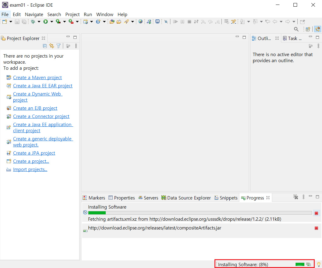 이클립스 하단에서 설치가 진행되고 있는것을 확인할 수 있습니다.