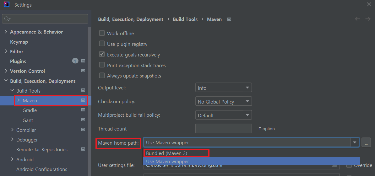 Maven home path 항목을 Bundled (Maven 3) 으로 변경합니다.